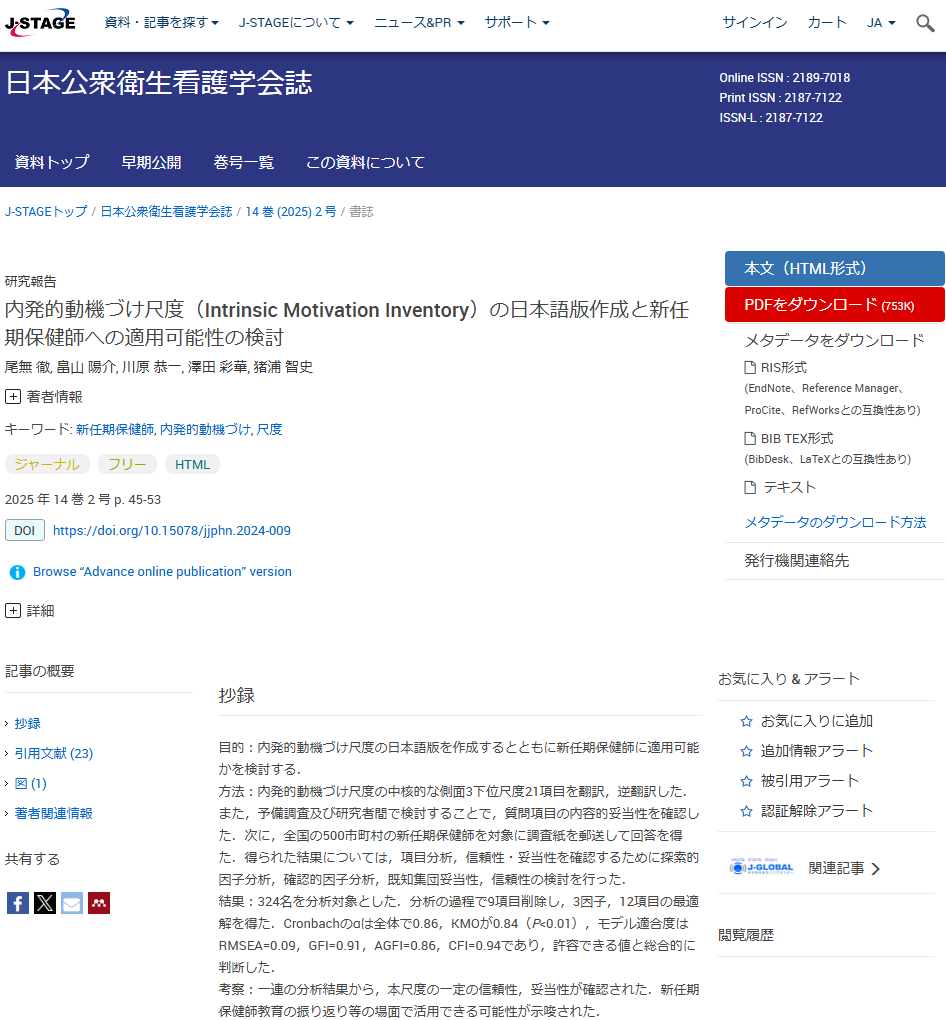 2025年9月1日、尾無講師を中心とした研究グループの論文「内発的動機づけ尺度(Intrinsic Motivation Inventory)の日本語版作成と新任期保健師への適用可能性の検討」が、保健師の主要学会誌である『日本公衆衛生看護学会誌』に掲載されました。