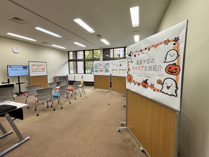 看護学部就職支援担当では,「看護学部でのキャリア支援の紹介」として,学生の目指す資格取得やキャリア形成の支援,そして,クラス担任・学生委員会・大学のキャリアセンターと連携した取り組みについてポスターで紹介しました.また,県内で看護師・保健師・助産師・養護教諭として活躍している本学部卒業生から,現在の職場における看護実践の様子や学生時代の過ごし方についてお話しいただいた動画を放映しました.