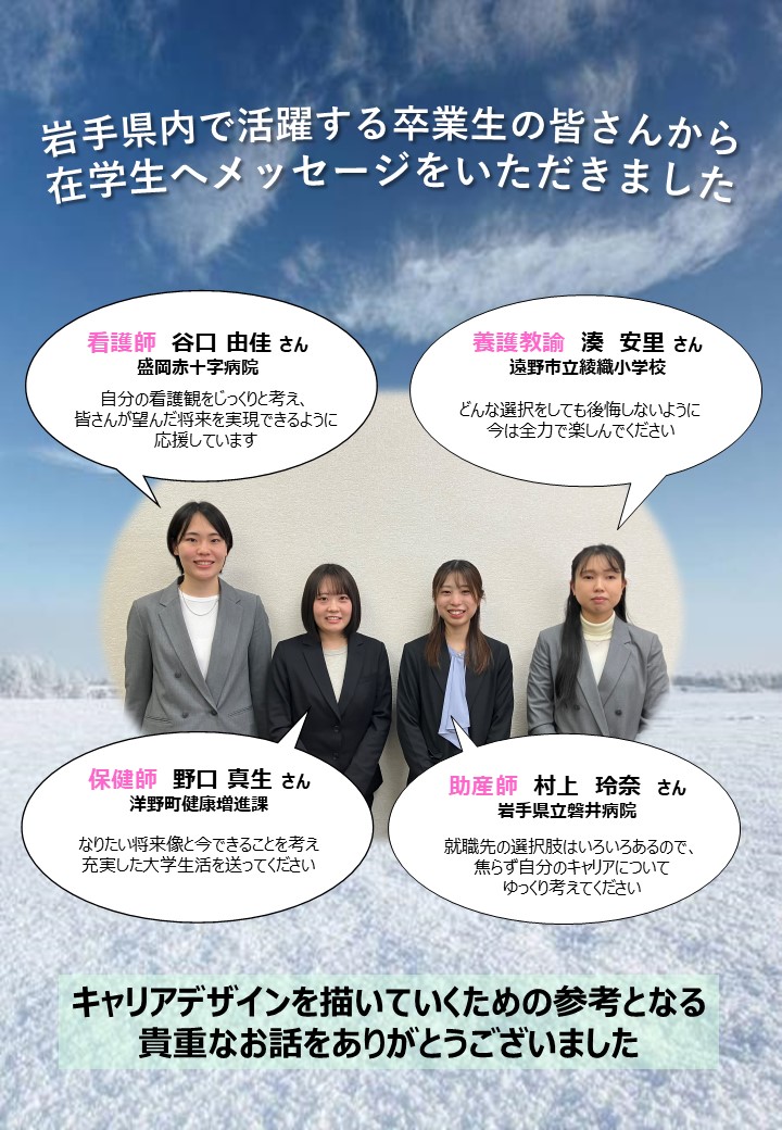 今回は「いま,自分の未来像についてじっくり考えてみよう」をテーマに,岩手県内で看護師・保健師・助産師・養護教諭として活躍している4名の卒業生からご講演いただきました.講師の先生方からは,働いている職場についての紹介,各職種の魅力ややりがい,就職活動を通して大切だと感じたことなど,様々なことをお話いただきました.