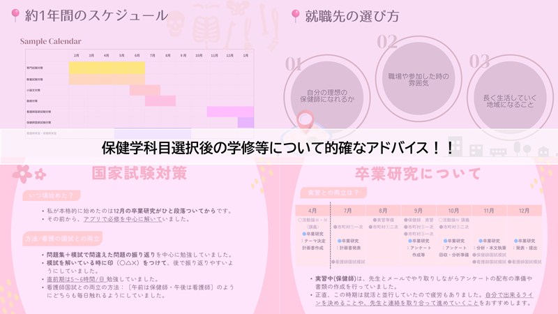 前半では、4年生2名より、保健学科目選択後の学修のポイントについてパワーポイントを用いて発表をしてくれました。2年間を通して大切にしてきた学びを軸にしつつ、「就職活動と国家試験」「卒業研究と実習」といったテーマごとに役割を学生が事前に分担し、3年生が今まさに知りたい内容を丁寧に伝えてくれました。完成度の高い資料と発表に、会場からは感嘆の声が上がっていました。