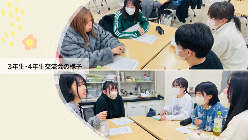 後半は交流会として、発表者に加え参加してくれた4年生と3年生が自由に意見交換を行いました。3年生からは「今しておくべきこと」「今後のスケジュールの立て方」など、発表内容をさらに深める具体的な質問が多く寄せられ、活発な交流となりました。終了後も立ち話が続き、将来を真剣に考える3年生の姿が印象的でした。